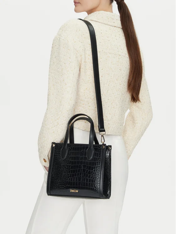 Crna torba DeeZee je kvintesencija elegancije i funkcionalnosti. Izrađena od visokokvalitetnog sintetičkog materijala, karakterizira se čvrstom strukturom, što osigurava njezinu trajnost i estetski izgled. Torba ima podesivi remen, zahvaljujući kojem se može nositi na ramenu ili u ruci, prilagođavajući duljinu vlastitim potrebama. Pretinac na patentni zatvarač jamči sigurnost pohranjenih predmeta. Dodatna prednost je mjesto za telefon, koje osigurava red unutar torbe. Odvojivi remen je praktičan element koji omogućuje promjenu stila nošenja. To je idealna torba za svaku priliku!