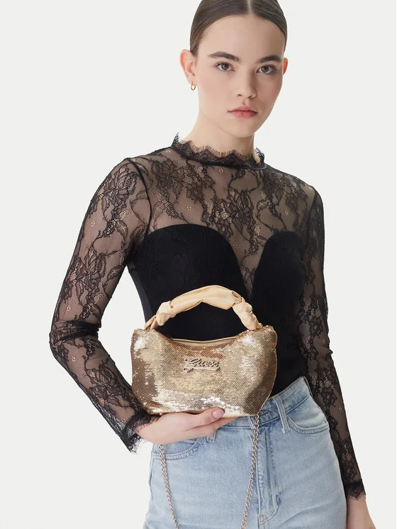 Torba Guess je stilizirani dodatak koji će oduševiti svaku mladu fashionistkinju. Izrađena od visokokvalitetnog tekstilnog materijala, savršeno spaja laganost s elegancijom. Njezina mala veličina čini je idealnom za sitnice, a mekana konstrukcija pruža udobnost pri korištenju. Ukrašena sjajnim šljokicama, torba privlači poglede i daje jedinstveni karakter svakoj kombinaciji. Priključeni lanac je praktičan i stiliziran akcent koji omogućuje nošenje na različite načine. To je dodatak koji će istaknuti jedinstveni stil svake djevojčice.