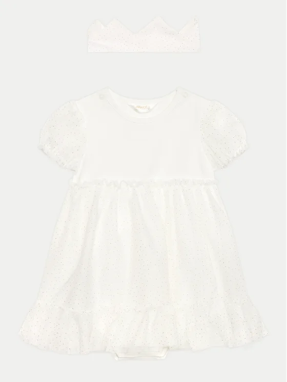 Fedezd fel az eleganciát a Mayoral márkájú ruhával, amely tökéletes különleges alkalmakra. Pamut, poliészter és elasztán keverékéből készült, így kényelmet és stílust biztosít. A kerek nyak kiváló megjelenést kölcsönöz és kényelmes viseletet garantál, a hátoldalon található pillangó pedig bájt ad a ruhának. A tüll alja és a rövid ujjú kialakítása könnyedséget és eleganciát kölcsönöz, míg a praktikus patentok megkönnyítik a fel- és levételt. A készletben egy aranyos fejpánt is található, amely tökéletesen kiegészíti az egész megjelenést.